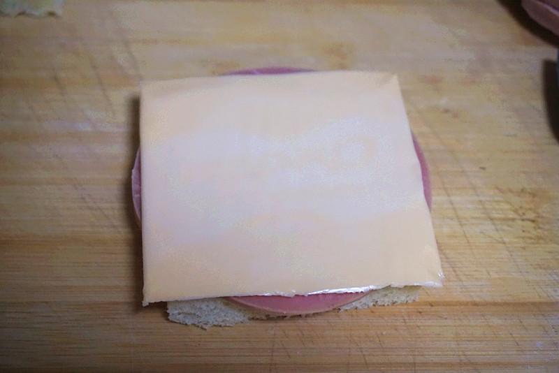 煎好的鸡蛋对半切开,和适量火腿一起加入吐司中。