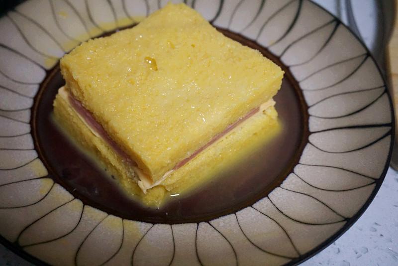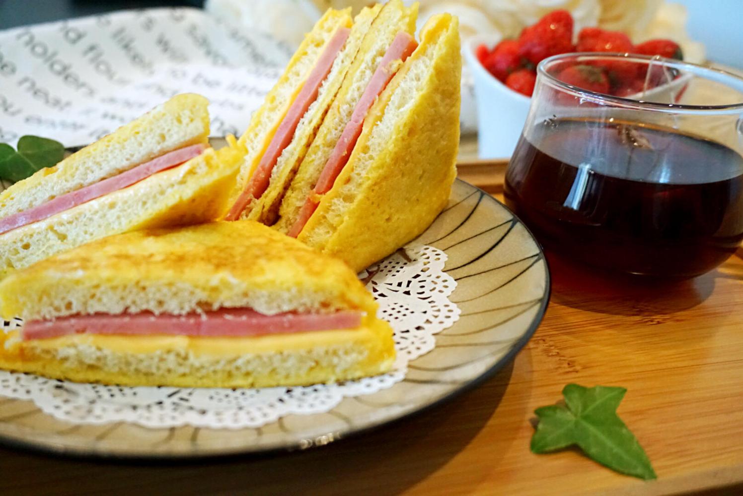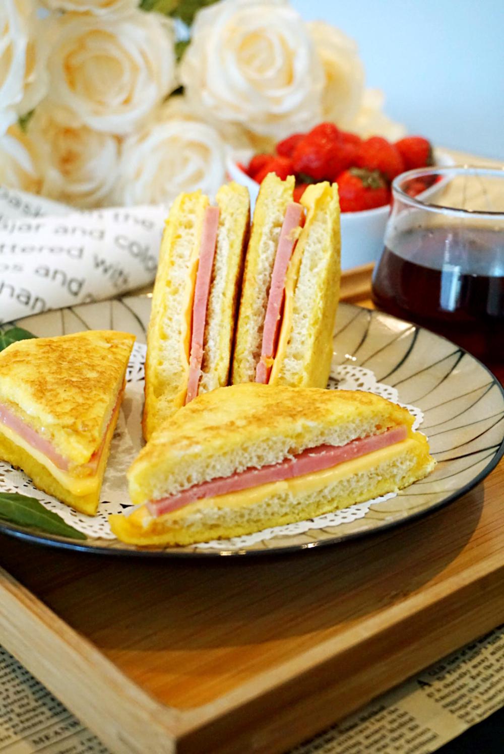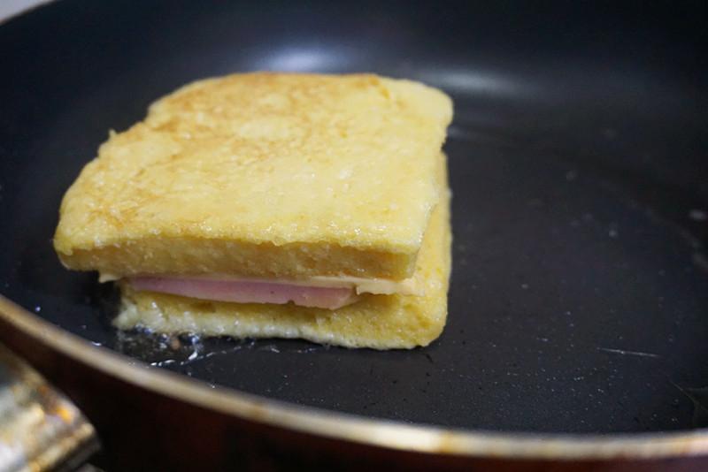这种做法比第二种更为省心,2个鸡蛋不是打成蛋液,而是做成煎蛋,加载吐司中。