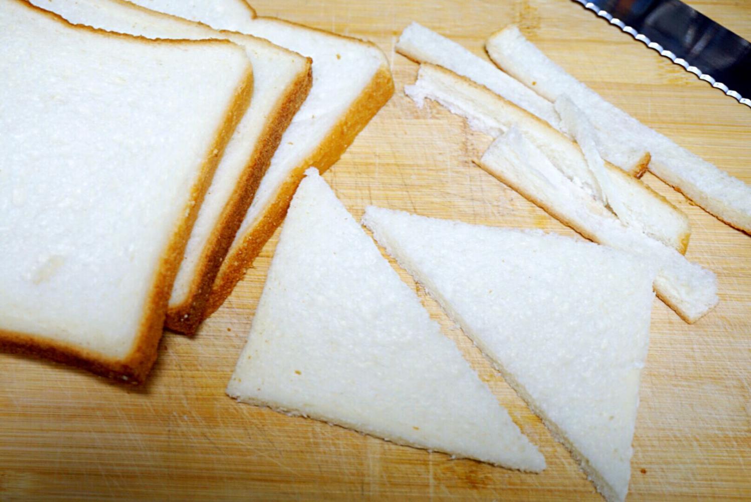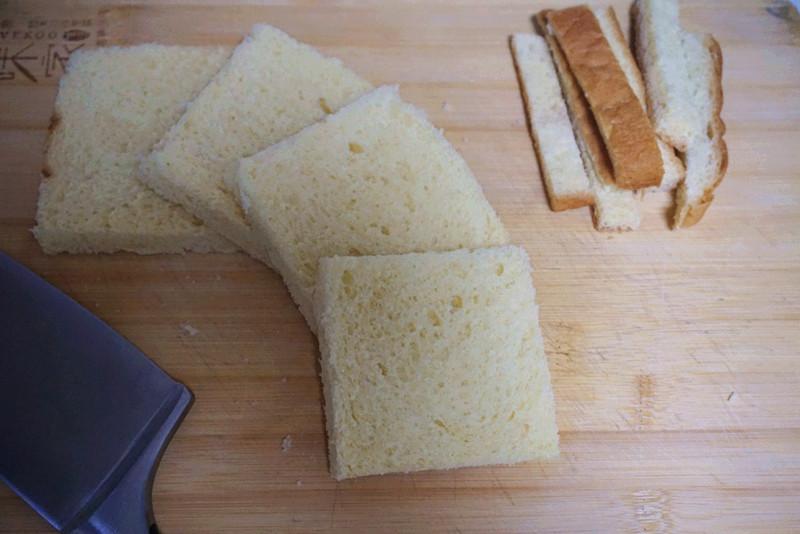 2、面包片去边。切下来的边角不要浪费,切丁后如烤箱170度10分钟,然后泡牛奶食用,味道相当棒。