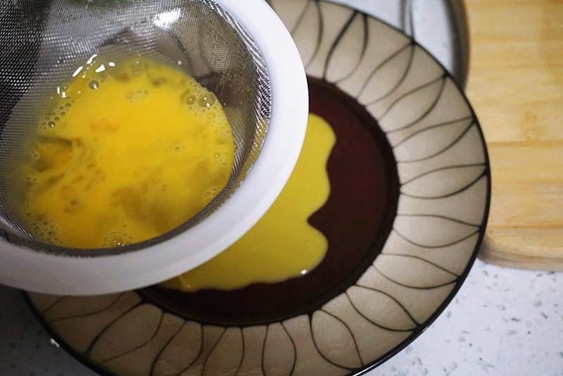 3、鸡蛋3个打散,加少量温水和少许盐,搅拌好的蛋液过筛。