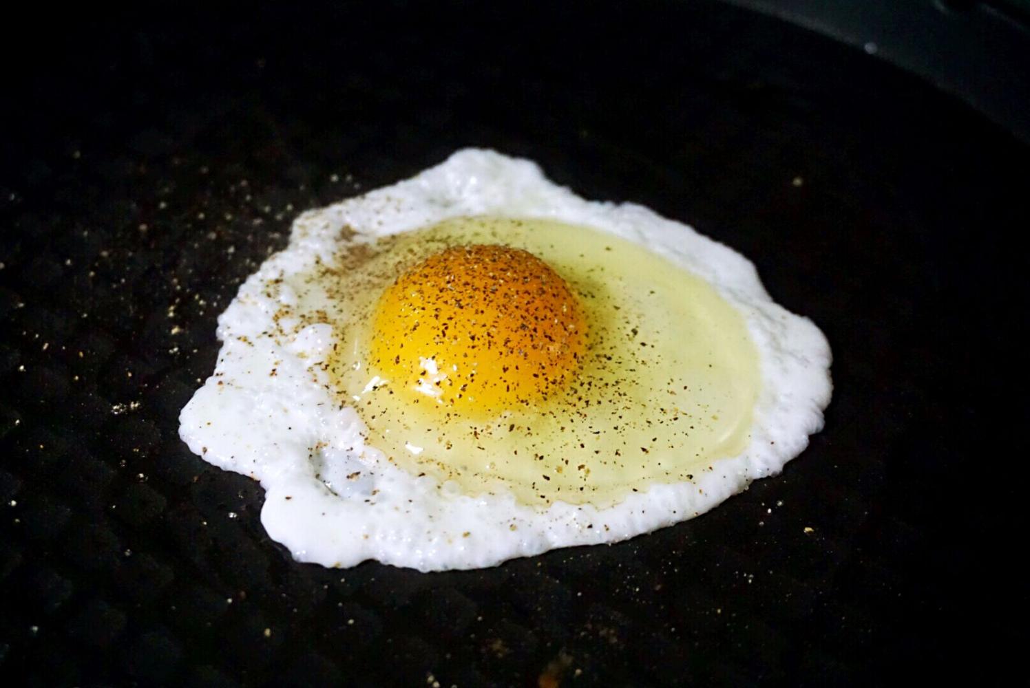 2个鸡蛋,表面撒上适量盐和黑胡椒粉,煎至两面金黄。