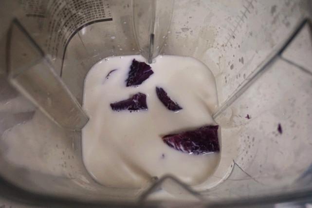 2、牛奶先取200毫升,和蒸好的紫薯混合,打成细腻的紫薯糊。