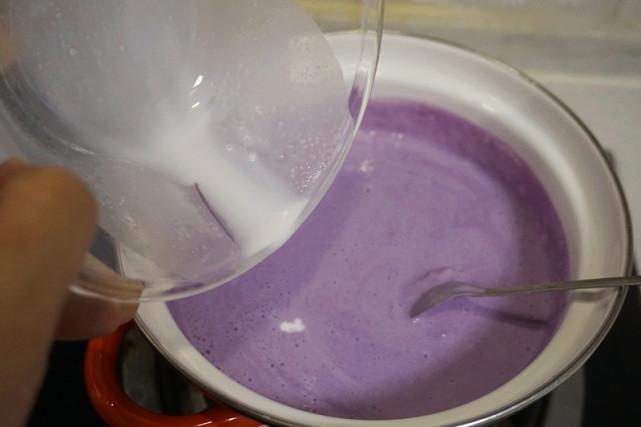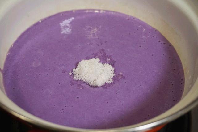 4、将紫薯糊倒入锅中,小火加热,倒入20克的白糖。