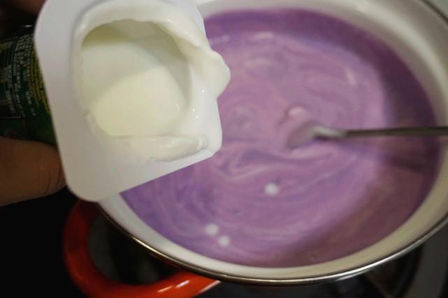 5、倒入50毫升的酸奶,煮到略带透明的粘稠状态。