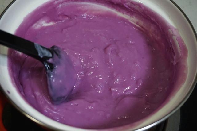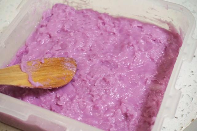 6、趁热把煮好的紫薯糊倒入容器中,尽量抹平表面。