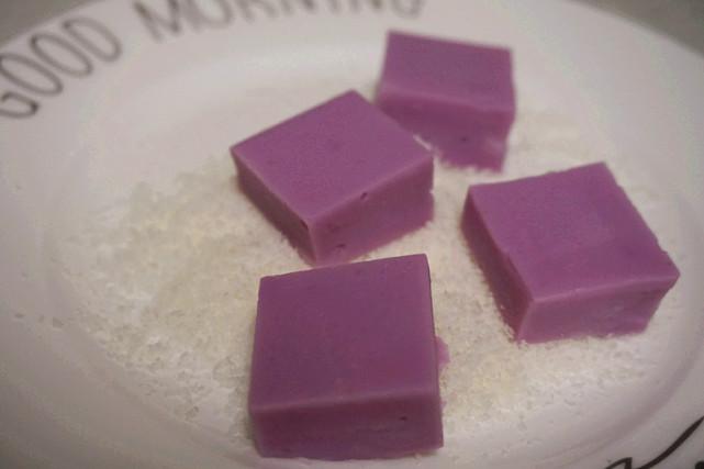 切成均匀的小方块,在椰蓉上均匀的滚上一圈。