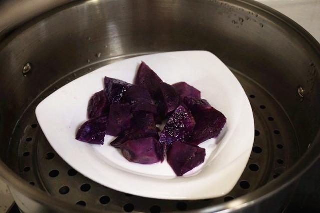 1、两个小紫薯,大概100克左右,去皮后蒸熟。