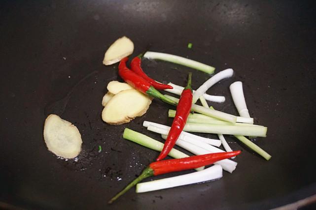 3、坐热油锅,放1小勺的食用油,爆香葱段姜片和辣椒。