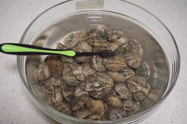 1、花蛤在盐水中浸泡1小时,使其吐沙,接着用小刷子刷净。