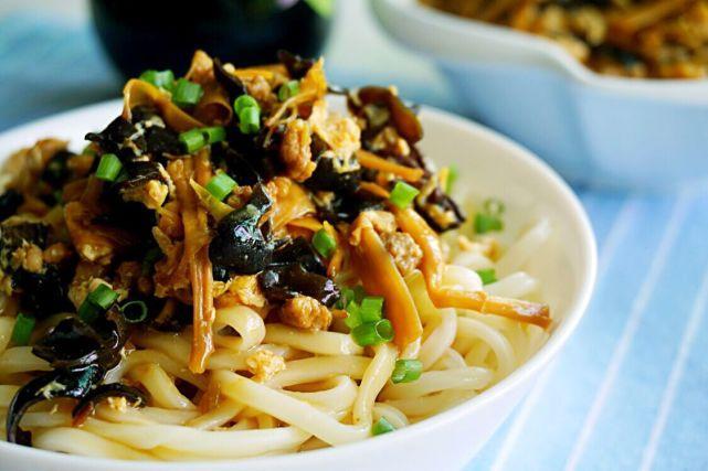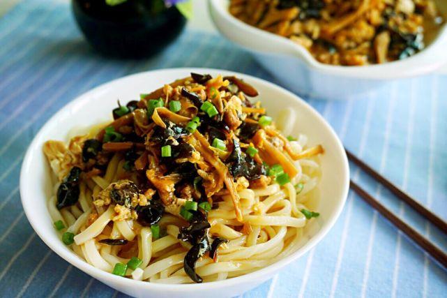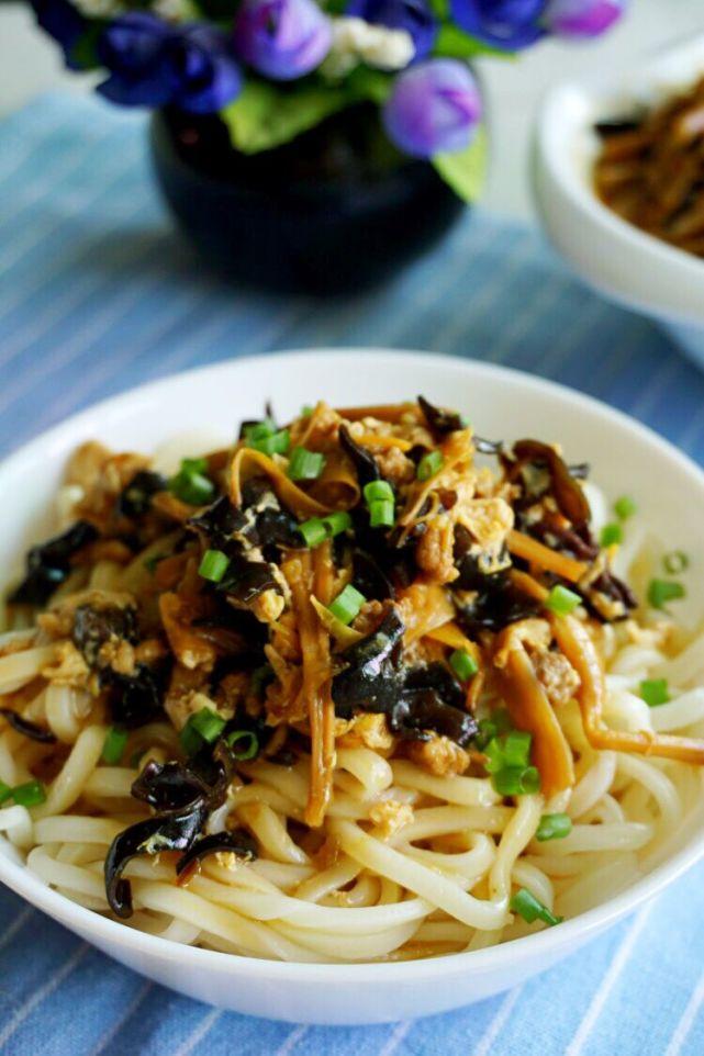 2、木耳洗净切细丝,黄花菜洗净切两段,香葱葱白和适量姜末一起爆香用。香葱叶切末拌面用。