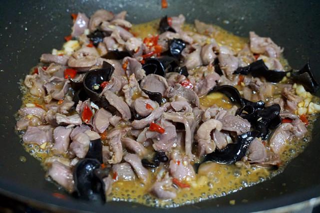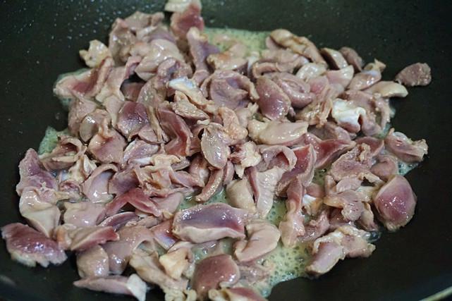 3、坐热油锅,放少许食用油,先放入鸡胗炒至变色。