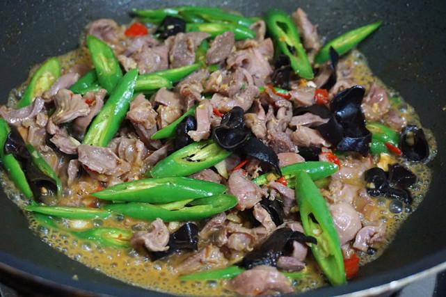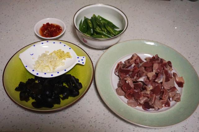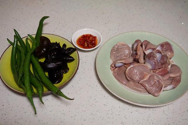 2、杭椒切斜段,鸡胗切小块用料酒和少许盐腌制一下,目的是去掉膻味。
