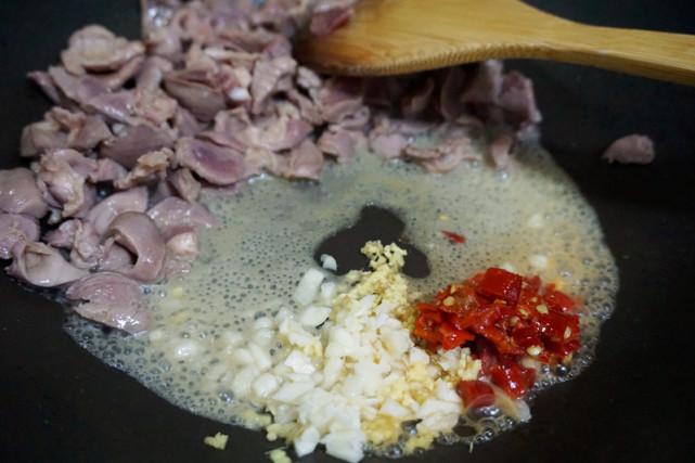 这个菜用蒜末和姜末爆香更好吃,目的都是减少鸡胗的腥味,更增脆嫩的口感,用蒜很适合。