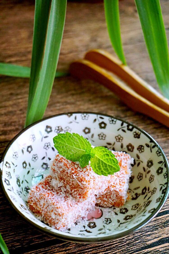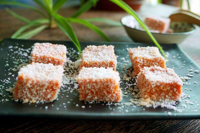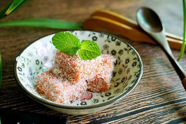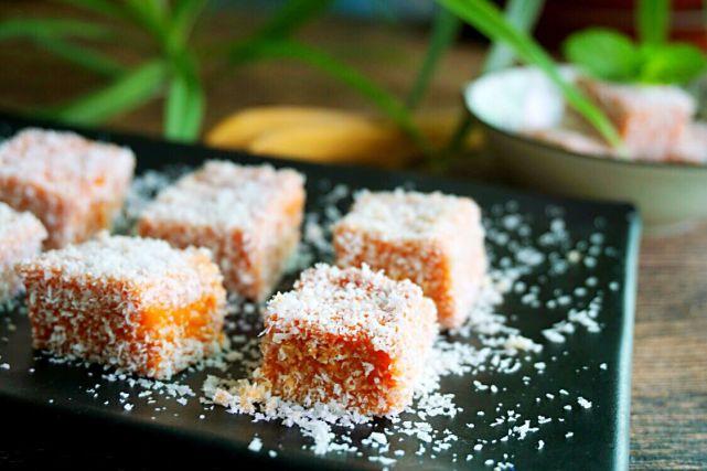 7、模具四壁不用涂抹油,凝固后的枸杞小方,很容易整块脱模。切小块在椰蓉中滚一圈即可。