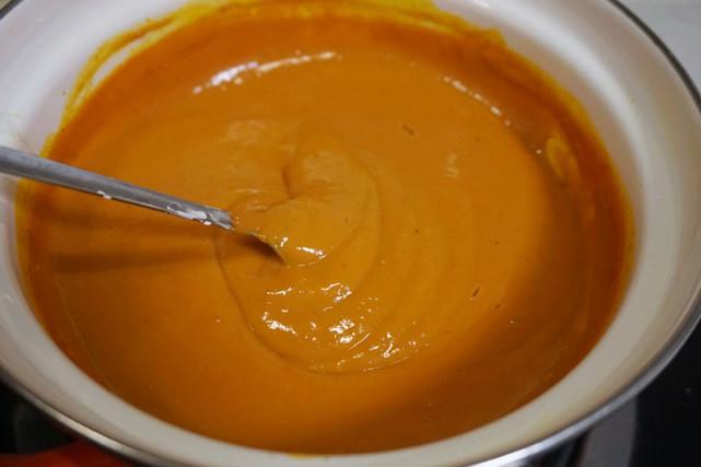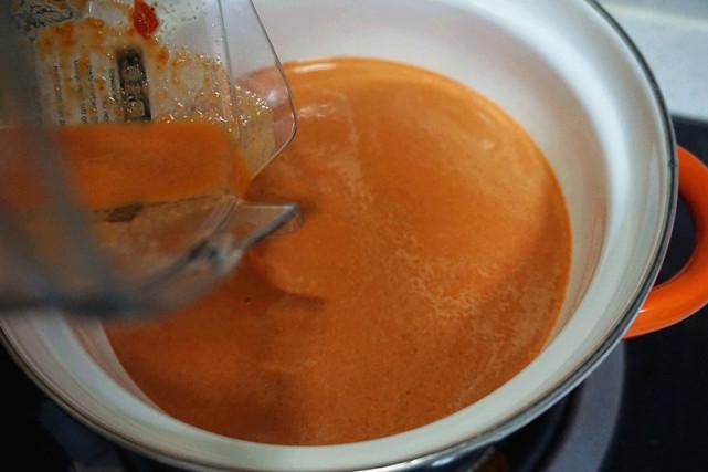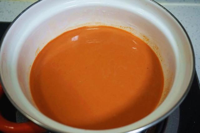 5、用中火将枸杞浆液煮沸,接着转小火,倒入水淀粉,边倒边搅拌。
