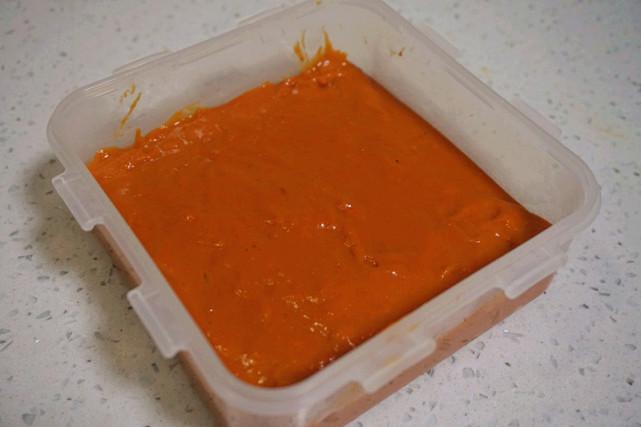 6、趁热倒入模具中,用勺背抹平表面。凉透后入冰箱冷藏4小时以上。