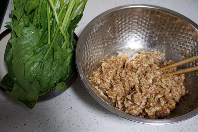 2、菠菜洗净过热水焯10秒,捞出沥干备用。