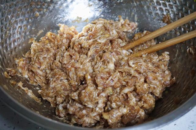 3、加入老抽、生抽、盐,沿着一个方式搅拌,期间加入料酒和花椒水,更增香,花椒水一次不要多放,放一小勺继续搅拌上劲。这样肉馅吃起来才有q弹的口感。