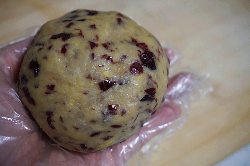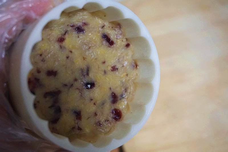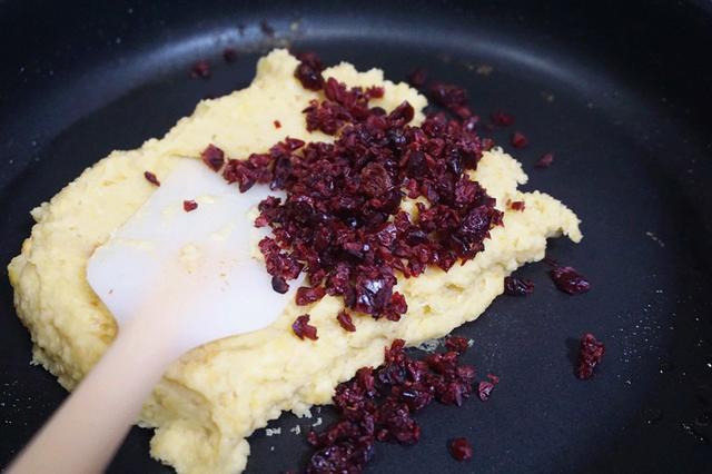 7、蔓越莓可以当馅料包入,但这样放入锅中和绿豆泥一起炒匀,味道更好。