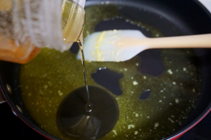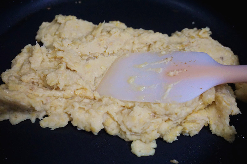 6、坐热平底锅,倒入60克的黄油,待融化后倒入蜂蜜50克,接着放入绿豆泥小火翻炒,直到绿豆泥完全吸收黄油和蜂蜜,呈现略干的状态。