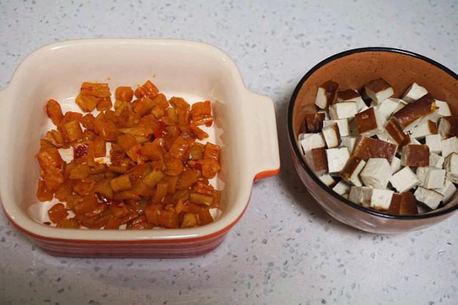 2、萝卜干我是从超市买的那种小咸菜,口味是咸辣的,切小块备用。熏干半块切小块。