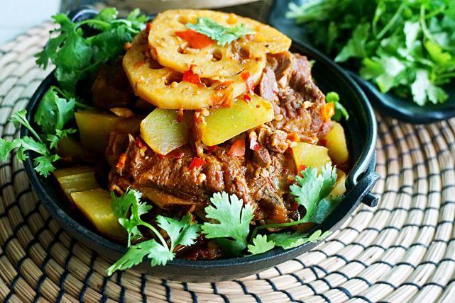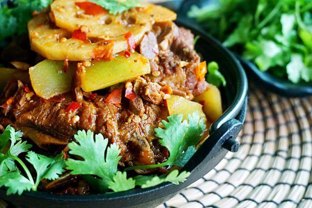 6、至于配菜用什么,选择家人喜欢的绿叶菜即可。这里花儿推荐凉血润肺的莲藕和清胃热利尿的莴笋,这两种食材,口感都清脆鲜香,而且营养功效最能抵消羊蝎子的油腻和可能带来的胃热积食。