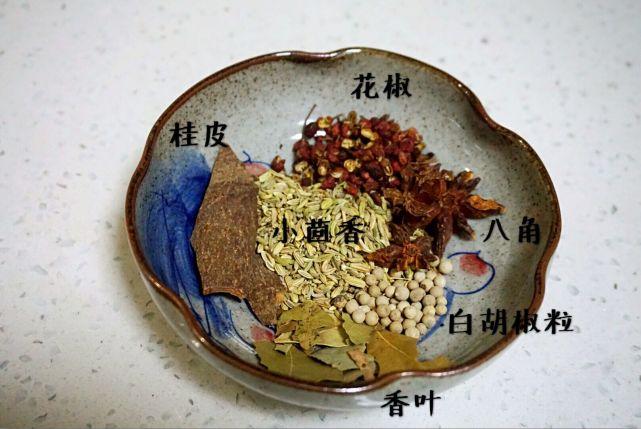 调味香料:花椒、桂皮、香叶、白胡椒粒、八角、小茴香