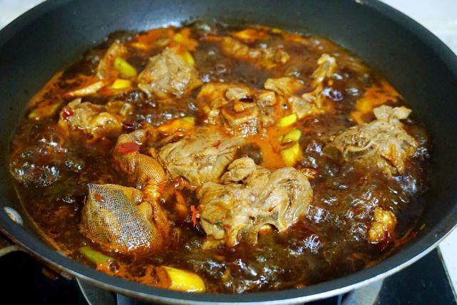 5、加入1勺老抽、2勺生抽,放入调味包和将将没过肉块的沸水。