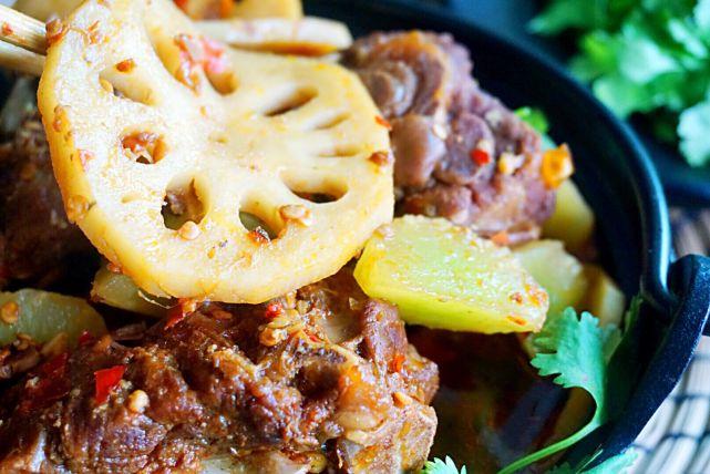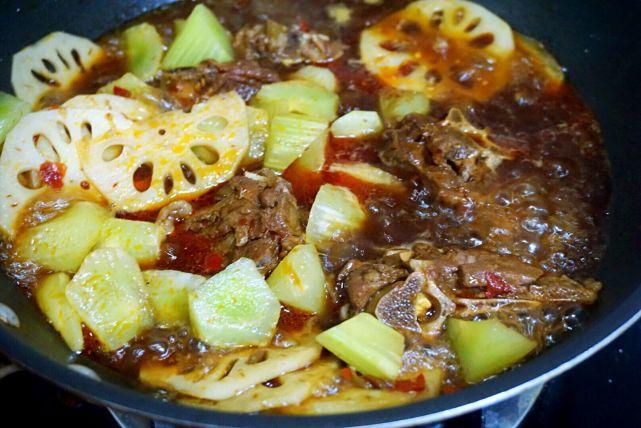 7、高压炖好的羊蝎子连同汤汁一起倒入小火锅,慢火咕嘟,放入藕片和笋块。