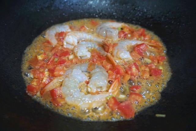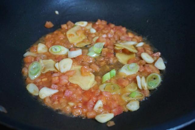 2、坐热油锅,放少许油,先爆香葱段姜片蒜片,接着放入番茄丁翻炒,炒出汁水。
