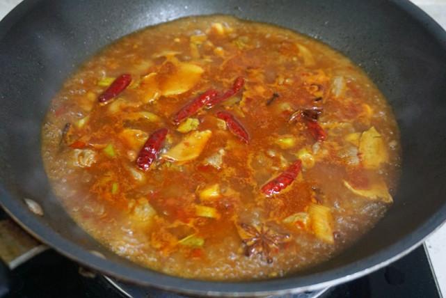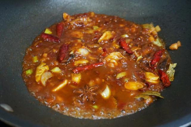 接着倒入香料,如果家里没有丁香,可以不放,但其他香料是不能少的。放入4大勺的郫县豆瓣酱,炒出红油。