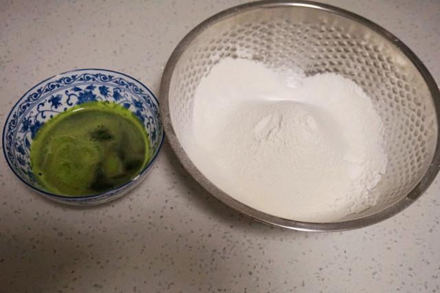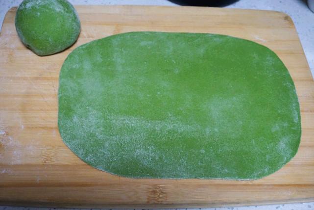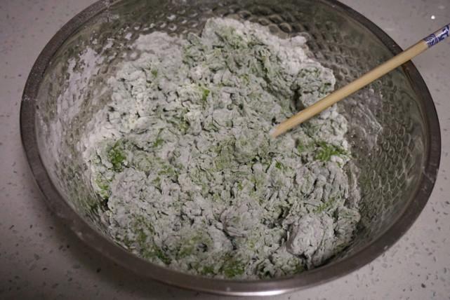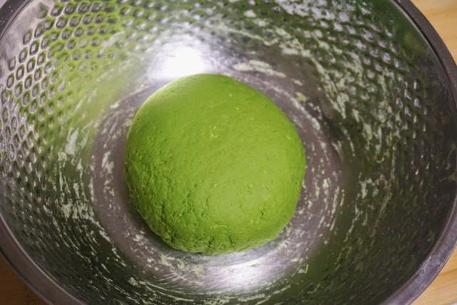 2、面团不用发酵,用筷子边搅拌边放入菠菜汁,揉成光滑的面团,盖上湿布醒发20分钟。