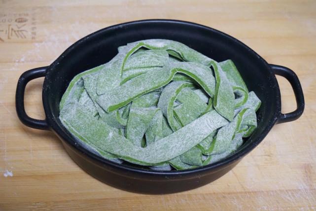 将面团擀上薄片,期间可以撒适量薄粉,防止擀出来的面条粘连。对折两次,撒薄粉,按照你喜欢的面条粗细,切均匀条状。