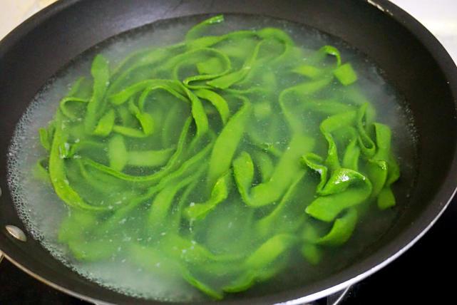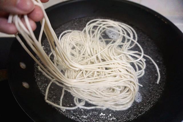 3、煮开一锅水,加一勺盐,下意面煮八分钟。锅内加入橄榄油,爆香蒜片。