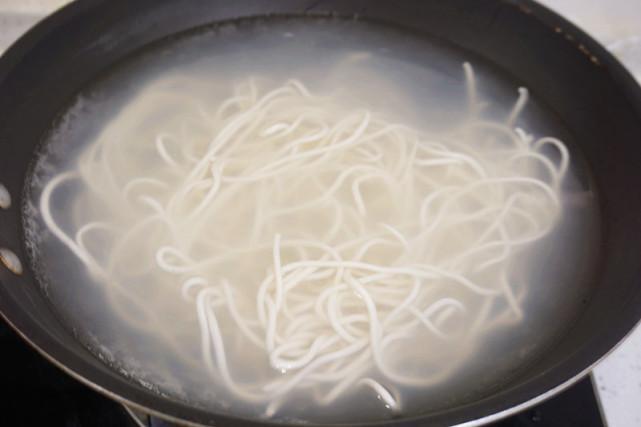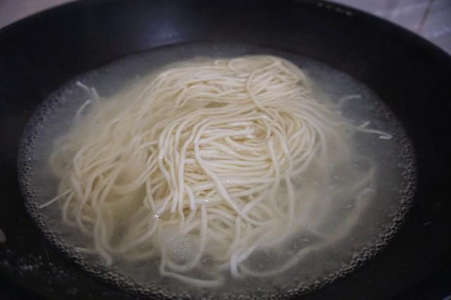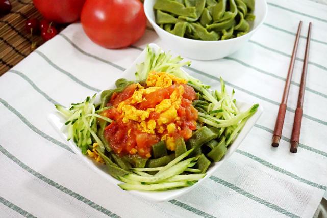 5、做开一锅水,下面条,期间在煮沸的时候,加凉水,加两次即可。出锅过一遍凉水(这时面条还是温热的,口感最好),拌入番茄鸡蛋卤,加适量黄瓜丝即可。