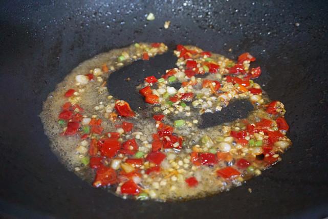 鲜辣的小米椒当然最好,但家里有不太能吃辣的人,只得退而求其次,放入2小勺的剁辣椒,辣味其次,再不能吃辣的就放干辣椒段。