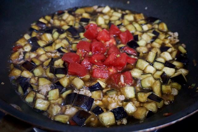 4、倒入没过茄丁的开水,倒入切好的番茄。大火煮沸后,转中火。