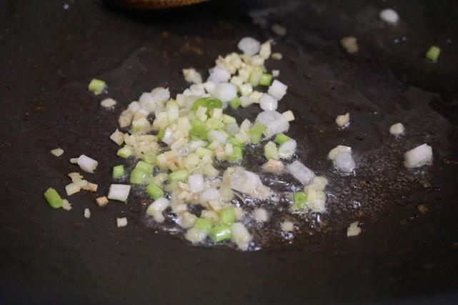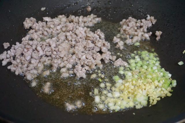 2、坐热油锅,先放少许食用油,放入肉沫快火煸炒,变色后捞出。接着锅内放少许油,爆香葱末姜末。