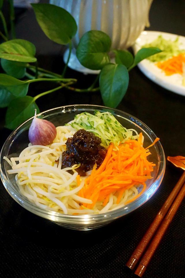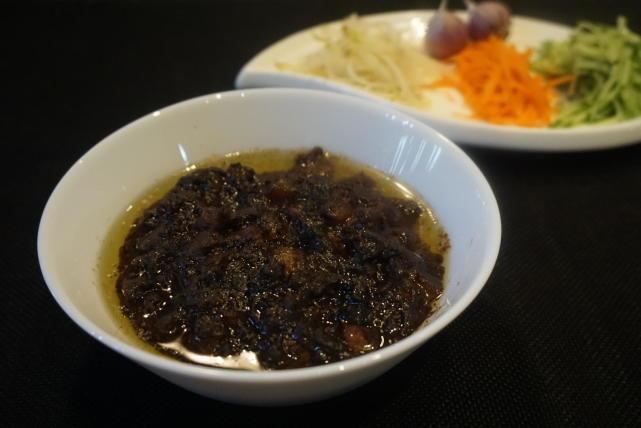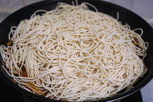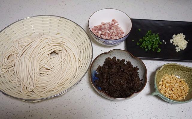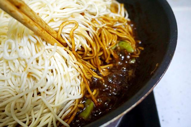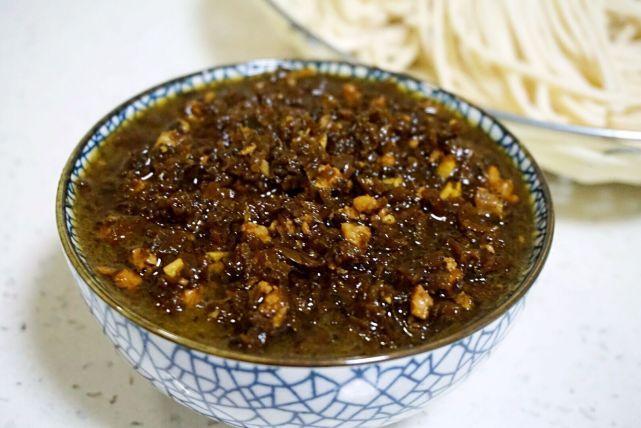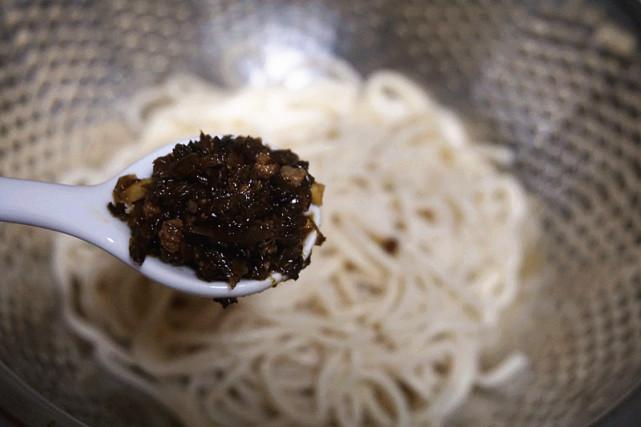5、面条煮好后过凉水,舀上一大勺炸酱,准备开吃。