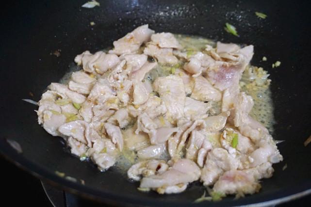 2、坐热油锅,放入葱末姜末爆香,接着放入肉片炒到变色,倒入1大勺的料酒。