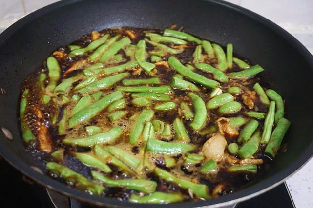 放入没过豆角的开水,水不能少,至少没过豆角,这个量有可能中途再加小半碗水。少了豆角发黑糊锅了,面条还没熟。