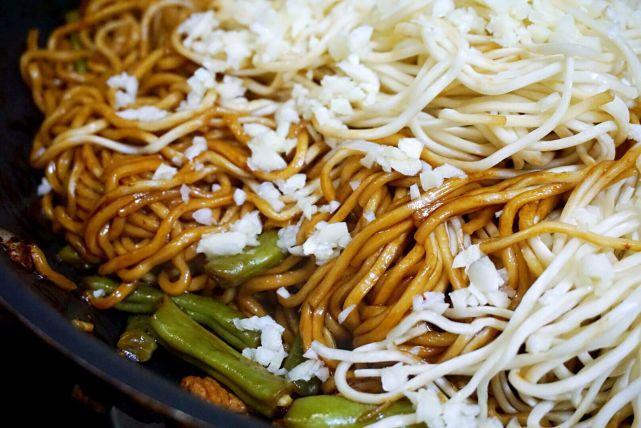夏季里吃扁豆焖面,特别的省事。洗好的豆角和切好的肉片,就如同日常的豆角炒肉一样操作,只不过在上面再平铺上一层面条。一锅焖好,主食炒菜都有了,再撒上蒜末在上面,那叫一个香。