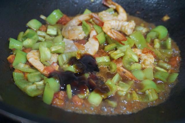 4、倒入刚才炒好的肉馅,加2大勺生抽、1大勺蚝油、适量盐,最后加入青椒丁,半分钟左右出锅即可。