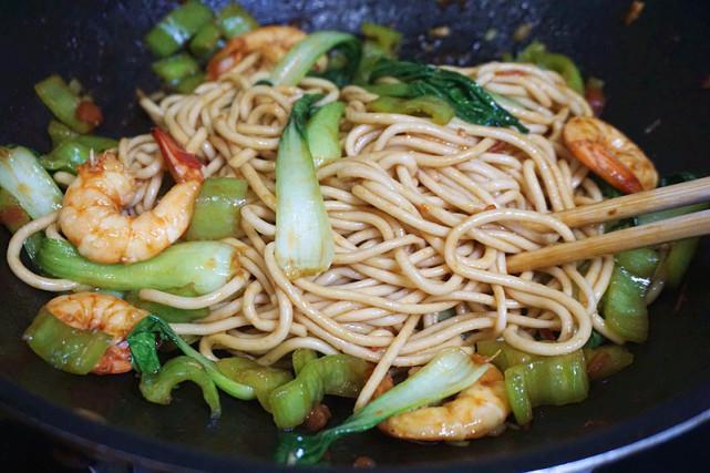 5、加入清洗干净的油菜,倒入面条,这时候可以用筷子翻拌,使得菜和面条相互包裹,期间尝尝味道,酌情放盐。