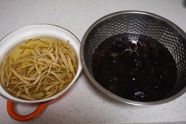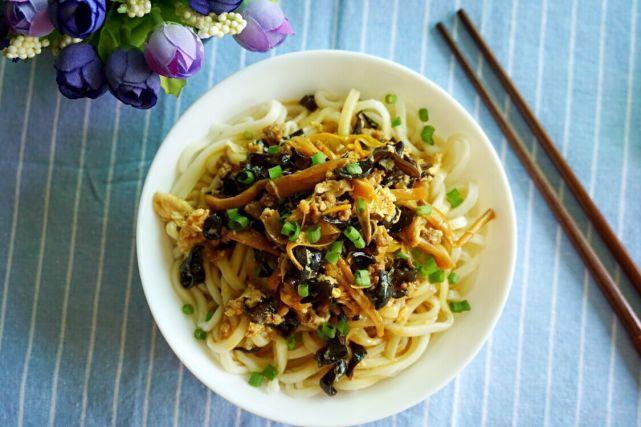 木耳洗净切细丝,黄花菜洗净切两段,香葱葱白和适量姜末一起爆香用。香葱叶切末拌面用。