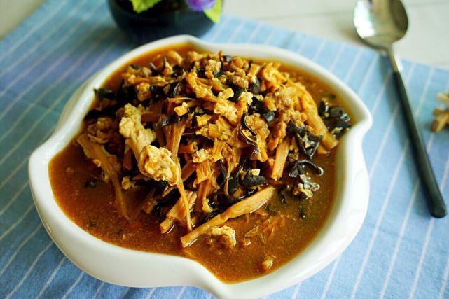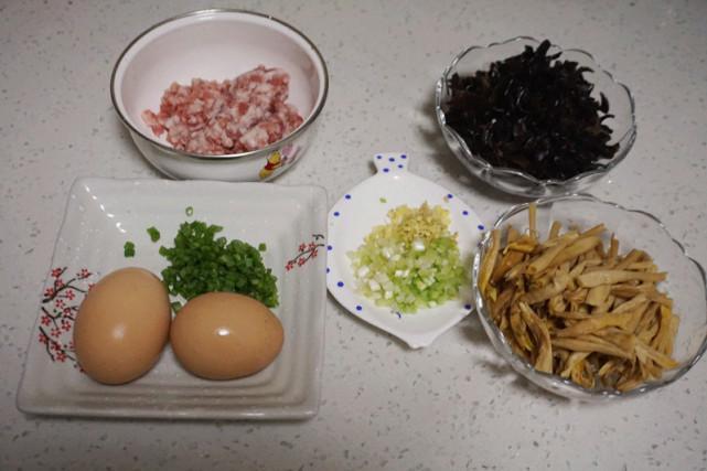 木耳15克;黄花菜30克;猪肉末80克;鸡蛋2个