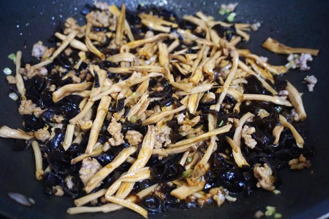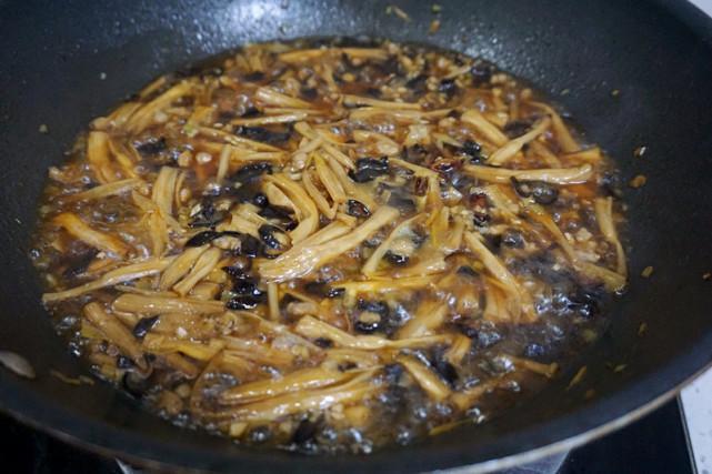 放入切好的木耳和黄花菜,加入2勺生抽1勺蚝油,1小勺盐。