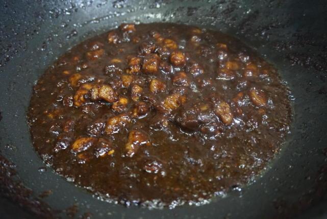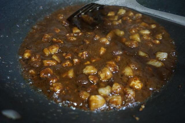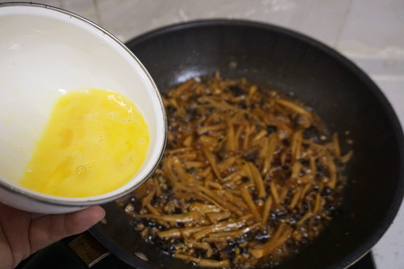 当汤汁减少到一半的时候,两个鸡蛋打散,倒入卤中,先不要搅拌,等稍微凝固后再翻炒。