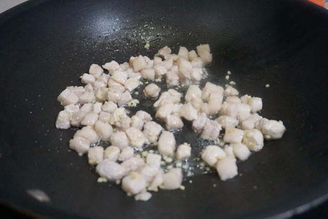 3、接着放入切丁,倒入2大勺的生抽、1勺的蚝油,翻炒均匀。