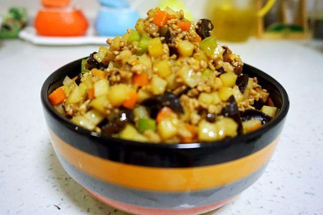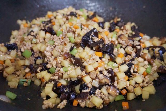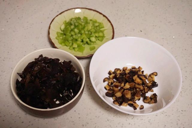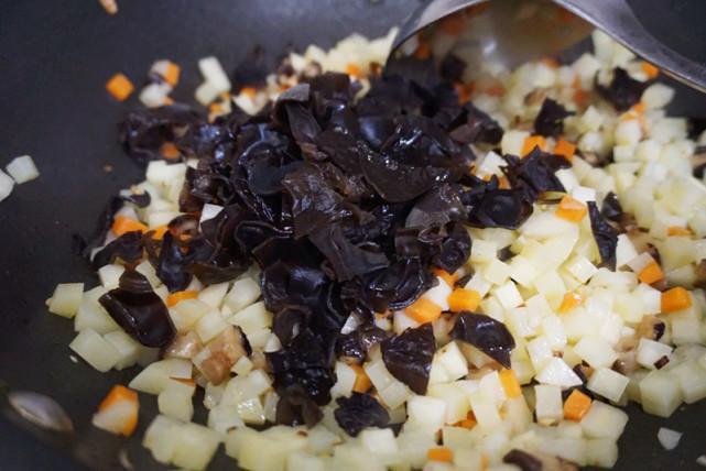 土豆切小丁后多过几遍水,洗掉淀粉。用干香菇,做出来更香,泡发切碎丁。木耳泡发洗净切碎块。
